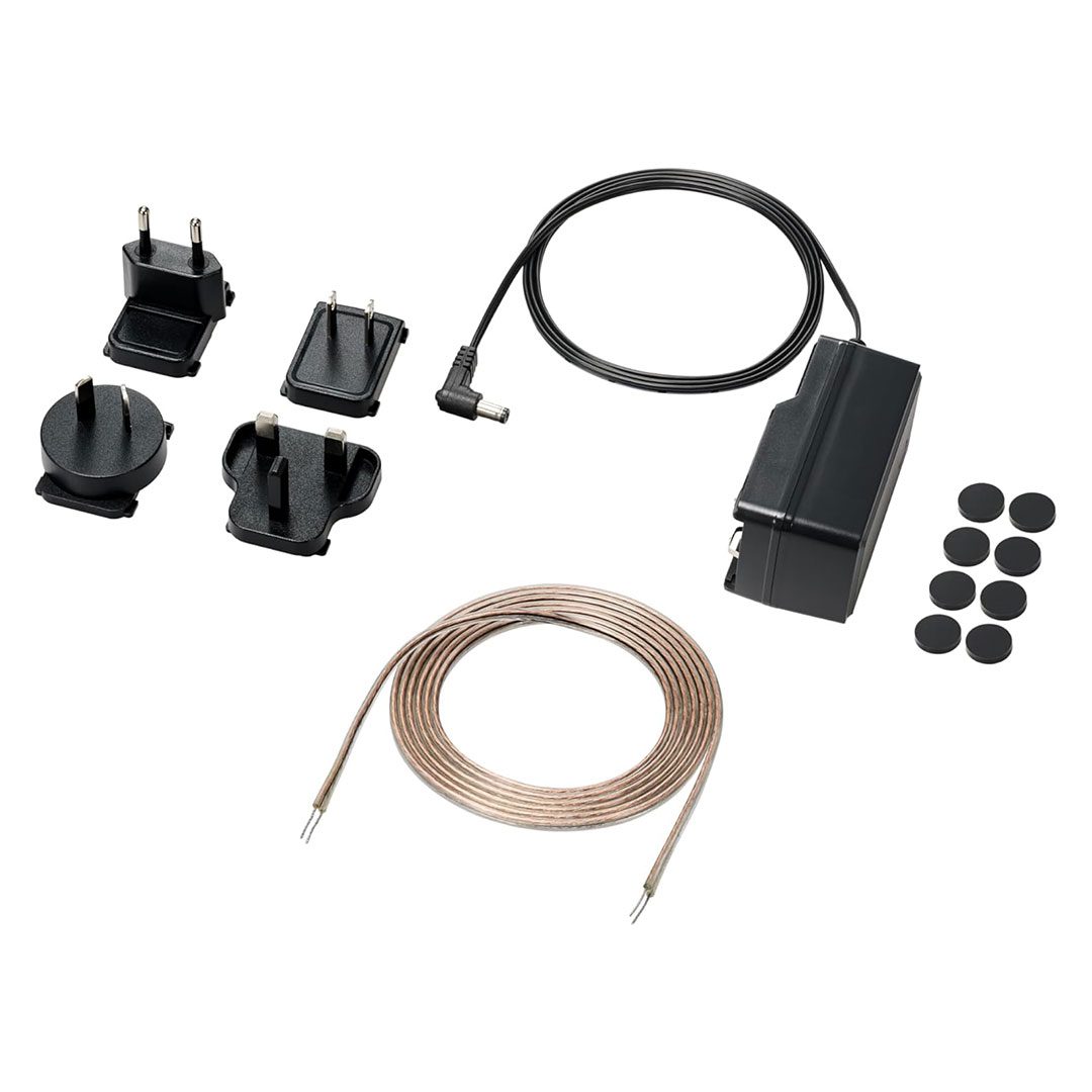 - Includes an AC adapter with three international plug adapters and a 6.6′ (2.0 m) speaker cable
